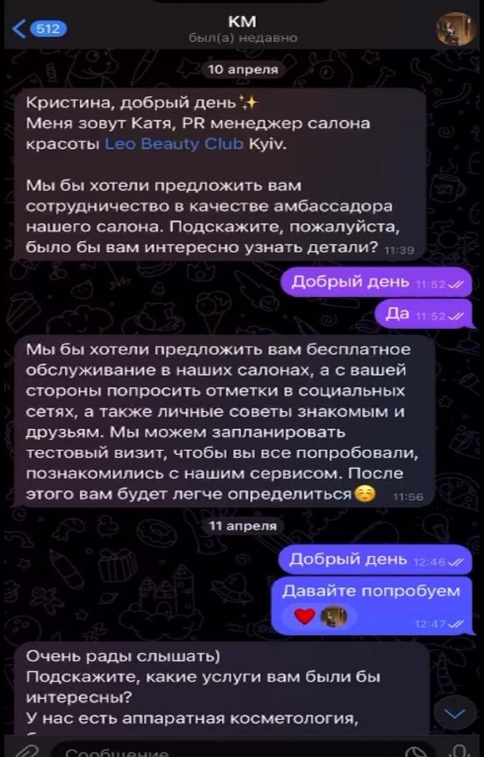 Салон краси "Leo Beauty", про який йшлося в розслідуванні, їй не належить. Сторіс, у яких йшлося "хто подарував тобі салон" означали, за її словами: "хто подарував послуги салону". Ці послуги були отримані на основі співробітництва у цілях реклами. У квітні співробітники салону вийшли на неї із пропозицією, щоб вона рекламувала їхні послуги, а за це запропонували безкоштовно користуватися послугами салону.