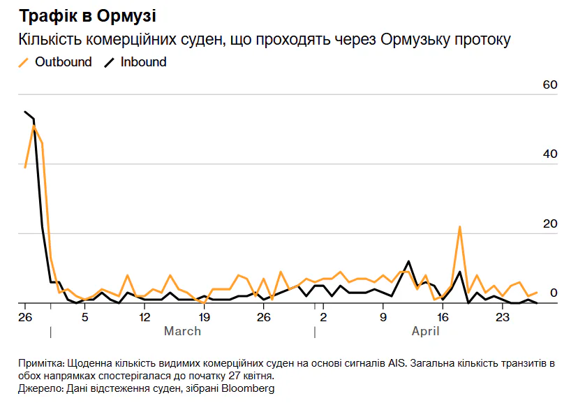 Попри формальне перемир’я з початку квітня, блокування Ормузької протоки різко скоротило транзит нафти, газу та нафтопродуктів майже до нуля. Це підштовхнуло ціни на енергоносії та посилило ризики інфляції.
