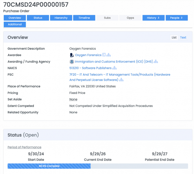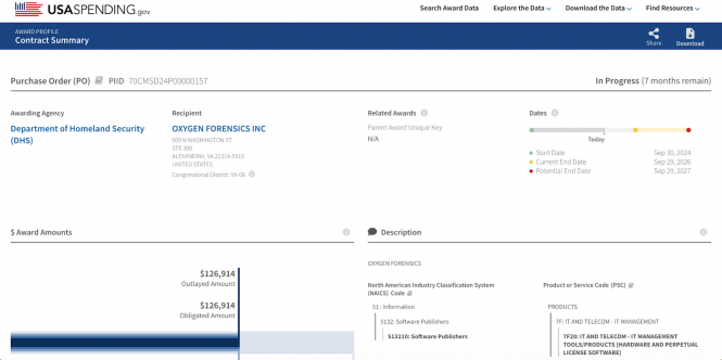 30 вересня 2024 року ICE уклало черговий федеральний контракт з Oxygen Forensics Inc. – компанією з цифрової криміналістики, що базується в Олександрії (штат Вірджинія). Її програмне забезпечення призначене для вилучення повідомлень, видалених файлів, історії місцеперебування, даних застосунків та іншої інформації зі смартфонів із подальшим формуванням структурованих слідчих звітів. Такі контракти зазвичай не привертають уваги публічно.