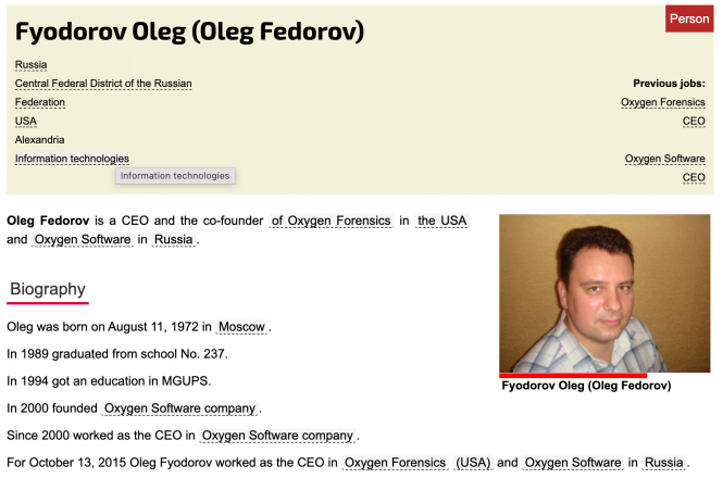 Понад десять років бренд Oxygen працює в обох країнах. Компанію Oxygen Software заснували в москві на початку 2000-х російські розробники Олєг Фьодоров та Олєг Давідов, а до 2013-го вона вийшла на ринок США під назвою Oxygen Forensics Inc. Американську компанію офіційно зареєстрували у штаті Вірджинія, після чого вона почала продавати програмне забезпечення для вилучення даних із мобільних пристроїв правоохоронним органам Сполучених Штатів.