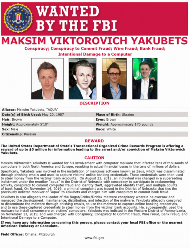 У грудні 2019 року ФБР висунуло обвинувачення проти Максіма Якубца, який, за версією відомства, проживає в росії. Слідство стверджує, що він очолював кіберзлочинну організацію Evil Corp, відповідальну за глобальні кампанії зі шкідливим програмним забезпеченням і програмами-вимагачами, унаслідок яких із фінансових установ та корпорацій у всьому світі було викрадено десятки мільйонів доларів. Сполучені Штати оголосили винагороду в розмірі 5 мільйонів доларів за інформацію, що призведе до його арешту – одну з найбільших винагород, які будь-коли пропонували за кіберзлочинця.