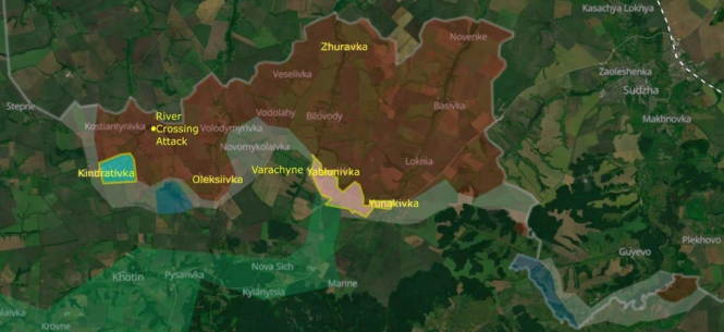 Курська/Сумська область. росія завдала авіаударів на захід, північ та всередині Кіндратівки. За 2 км на північний схід від Кіндратівки знищено гумовий човен, який переправляв росіян через річку. Бомбардуванню піддалися російські позиції та склади за 2-4 км на північ від Зурівки. Бомбардують українські позиції на південь від Варачиного, а голландська версія М113 була підбита двома дронами під Варачиним, але все ж таки змогла вивезти 11 солдатів у безпечне місце. росіяни в Олексіївці були помічені та атаковані. На заході – бомбили Тьоткіно.