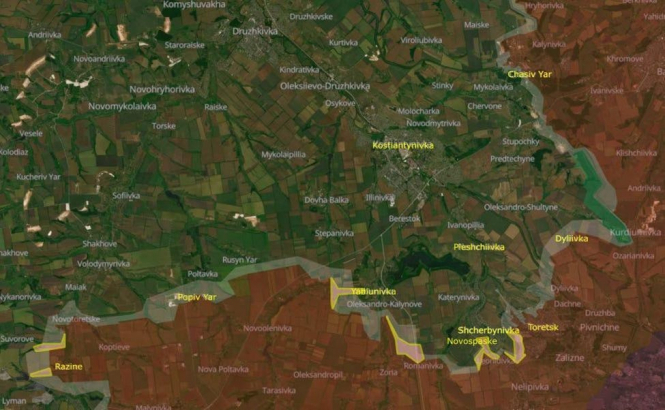 Торецьк. Курт і Ко з 28-ї бригади атакували росіян у Дильовці. Атакують українців у Плещіївці. Рубікон атакує українців у східній Яблунівці. Україна атакує росіян у західній Яблунівці. росіяни піднімають прапор у Новоспаському. Вдень Рубікон помічає машину в Косянтинівці, і коли дрон переслідує машину, правило – негайно вийти з неї. Бої в Щербинівці, яка зараз оточена з трьох боків. Минулого тижня росія не змогла просунутися на північ від Попового Яру.