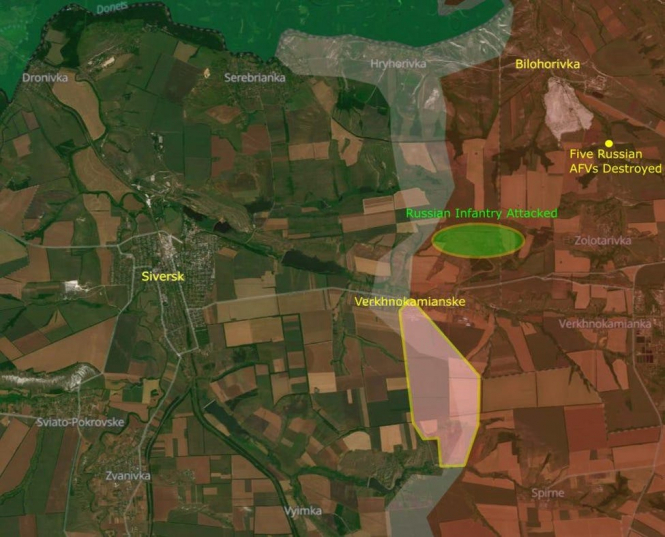 Сіверськ. 54-та бригада знищила п'ять одиниць бронетехніки при спробі переправитися через невеликий струмок на південь від Білогорівки і в 5 км від фронту, а також знищила піхоту на північ від Верхньокам'янського.