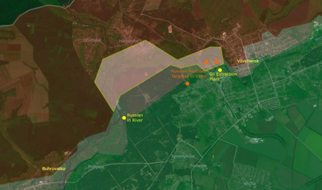 Вовчанськ. росіяни зайняли ліс на захід від Вовчанська і край північно-західної частини міста. російських солдатів переслідують на пустирі, в лісі, біля річки та на території олійноекстракційного заводу. Річка шириною 60 метрів знаходилася за 2 км на захід від міста. За 16 км на північний захід від Вовчанська – російська техніка.