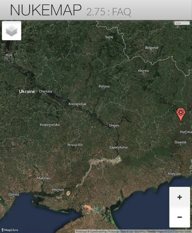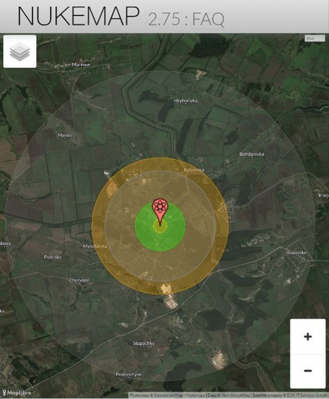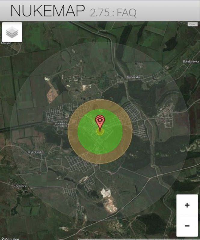 Над Часовим Яром, містом на сході України, що перебуває під постійним штурмом, було проведено дві симуляції. Одна з них моделювала удар потужністю 10 кілотонн, інша – детонацію 50 кілотонн, що приблизно втричі перевищує потужність бомби, скинутої на Хіросіму.