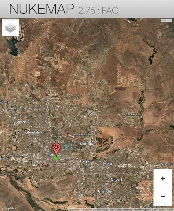Зображення, створені для цього аналізу, показують повітряний вибух потужністю 10 кілотонн, еквівалентний за потужністю деяким найменшим ядерним боєприпасам, які можна доставити над міськими і напівміськими цілями. У Феніксі, штат Арізона, руйнування сягають центру міста, але зупиняються на невеликій відстані від метрополітену. У Москві така ж потужність зрівняла б з землею частину центру міста, але залишила б більшу частину столиці працездатною.