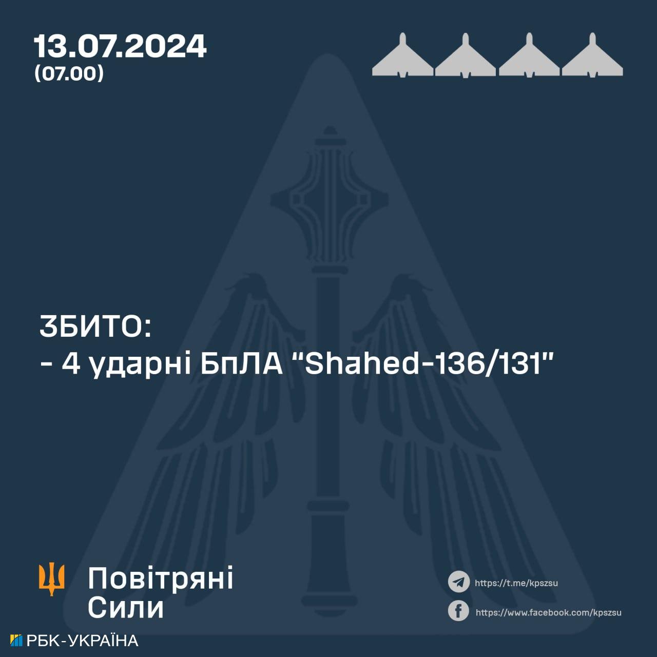 Зазначається, що окупанти у ніч проти 13 липня під час повітряного нападу запустили по Україні 5 ударних безпілотників типу "Шахед" із Приморсько-Ахтарська (Російська Федерація).