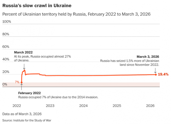 Наразі російські війська окупують 19,4% території України. Під час першої фази війни у 2014 році вони захопили близько 7% території України, а незабаром після початку повномасштабного вторгнення у 2022 році окупували загалом 26,8%. У результаті подальших контрнаступів України у листопаді того ж року росіяни утримували лише близько 17,9% території України. Відтоді росія захопила лише 1,5% української території, зазнавши при цьому понад 1 мільйон втрат. Для порівняння: росії знадобилося три з половиною роки, щоб захопити 9 318 квадратних кілометрів – площу, меншу за Ліван або округ Лос-Анджелес. Як зазначають інші, нібито невблаганний похід путіна до перемоги просувається повільніше за равлика.